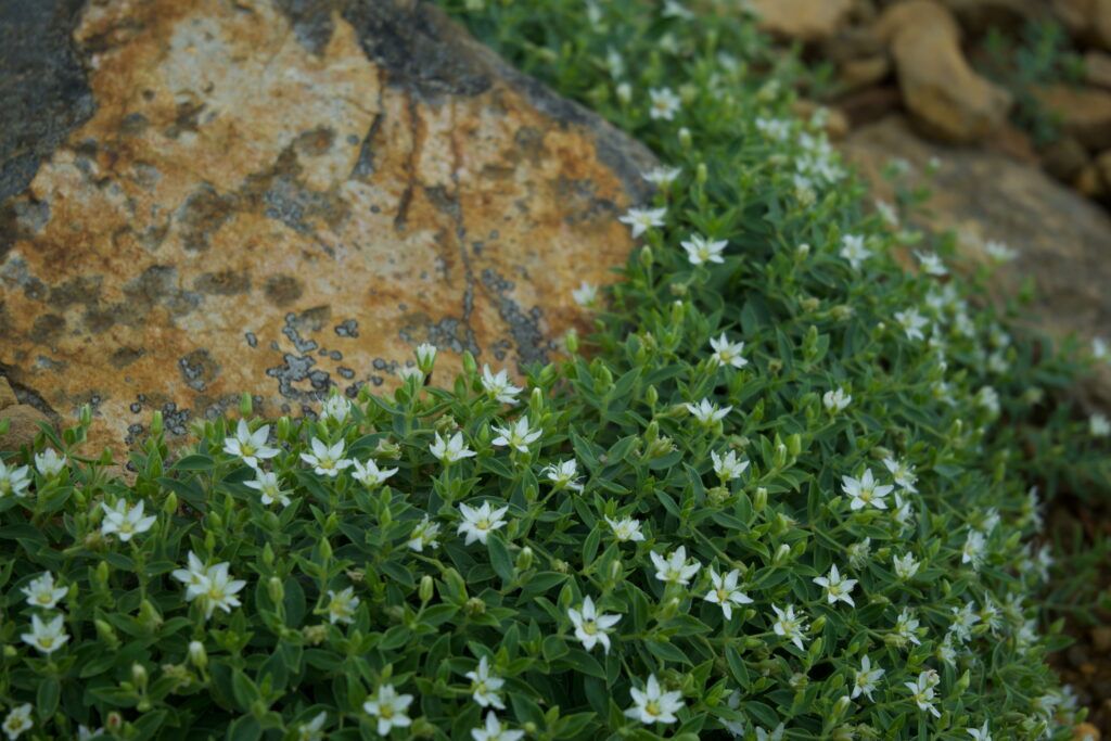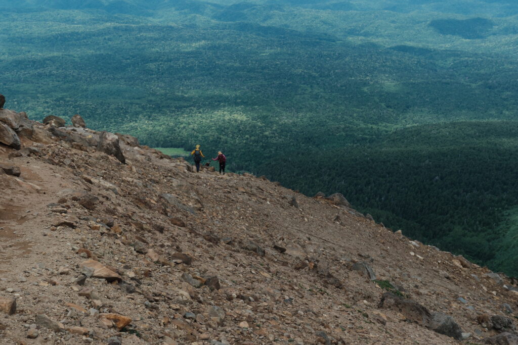 樹林帯を抜けるとざれた火山らしい登山道が続く 風が強くて持っていかれる〜